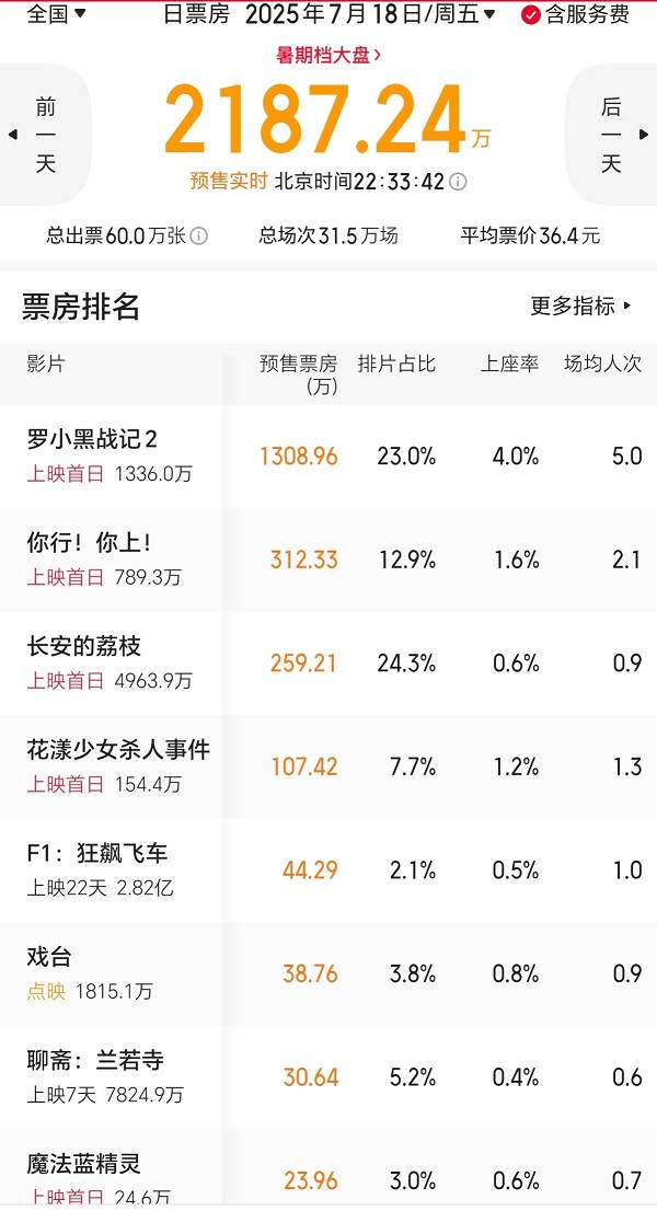 在五部新片扎堆上映的7月18日(周五),《罗小黑战记2》预售票房遥遥领先,远超《你行!你上!》《长安的荔枝》《花漾少女杀人事件》《魔法蓝精灵》等其他四部同日开画的新片。
