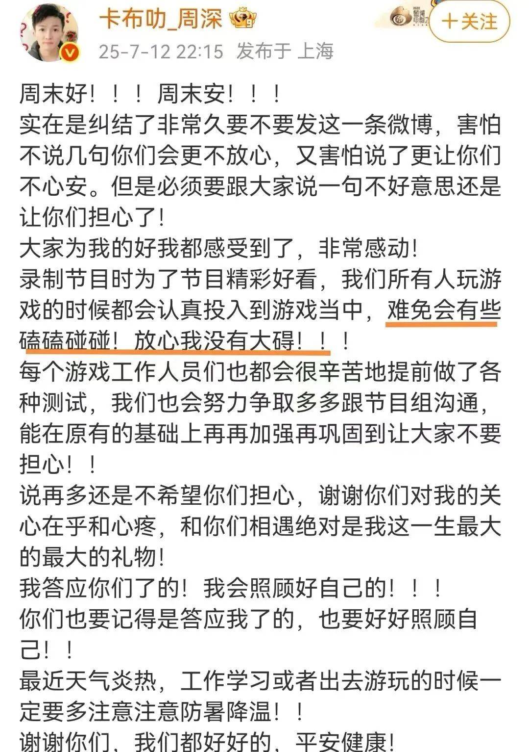 综艺节目本想借“真实”吸引眼球,但最终却将“安全”踩在了脚下,忽略了最基本的保障。当节目组专注于镜头能否足够炸裂,话题是否足够热门时,他们早已忘记了最根本的责任。回看这场综艺闹剧,把危险当做看点,将伤痛作为笑点,已经完全偏离了竞技精神的核心。节目组欠周深的不仅仅是一句道歉,更是一场对“安全”严肃重新审视的反思。