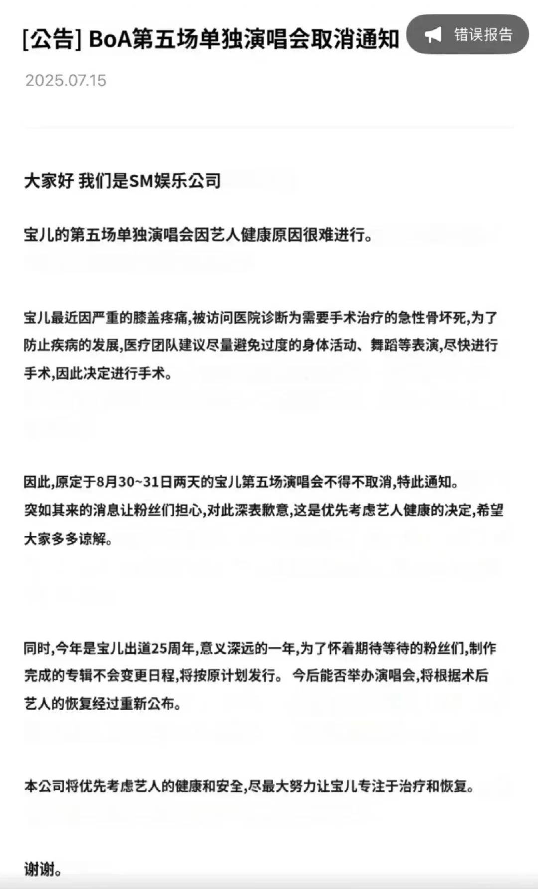公司补充道:“BoA决定根据医生的建议进行手术,以防止病情进一步恶化,并避免剧烈的身体活动,尤其是舞蹈等表演。”因此,BoA原定于8月30日至31日在首尔蚕室室内体育馆举行的第五场个人演唱会将被取消。