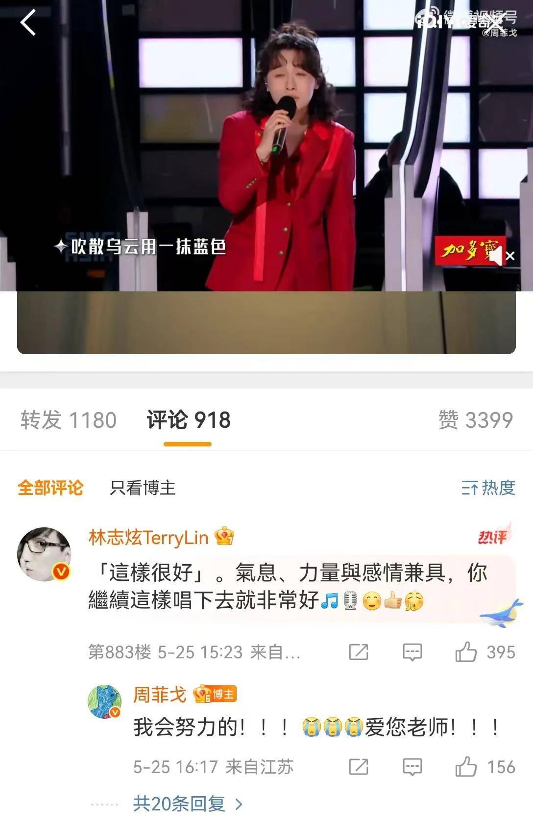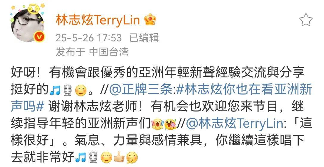 被淘汰后的林志炫也没闲着,开始在网上关注起新节目亚洲新声。他看到选手周菲戈在节目里的表演后,忍不住发微博夸周菲戈唱歌气息稳、力量足,感情也很充沛。这一夸可不得了,迅速引发了网友的关注。亚洲新声节目组知道后,赶紧向林志炫发出邀请,希望他能来当导师。令人惊喜的是,林志炫很快就回复,乐意接受邀请。