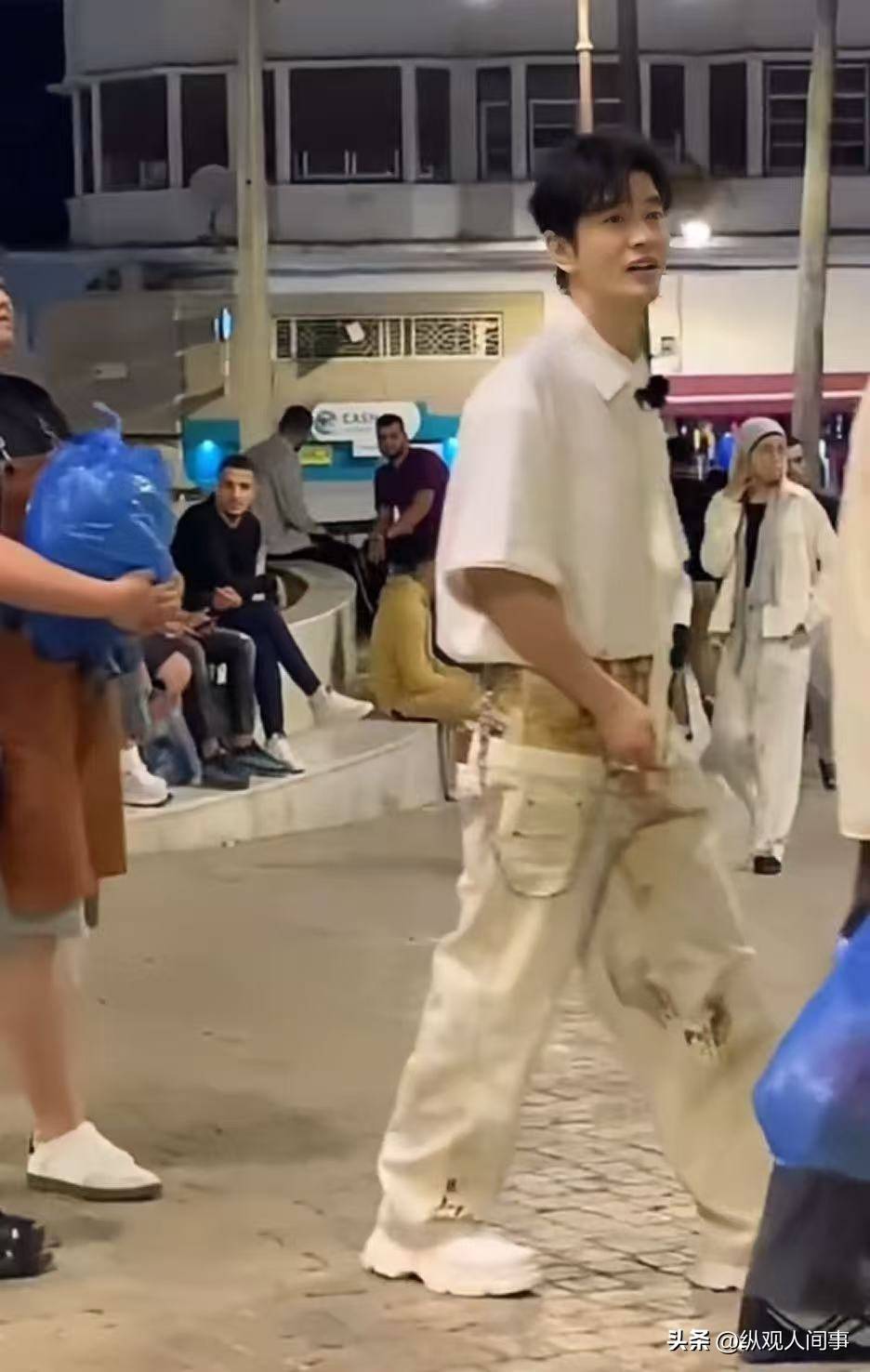 相比之下,老嘉宾蔡国庆则完全展现出另一番景象。他步伐沉重,走路摇摇晃晃,身穿白衬衫的衣服也被弄得皱巴巴,脑门上的油光反射出疲惫的光芒。他挺着大肚子,手中提着购物袋,不断在前面走着,频频回头看后方慢吞吞的人群,脸上满是无奈和心酸。显然,蔡国庆早已心生退意,但身处异国,只有大家抱团取暖。