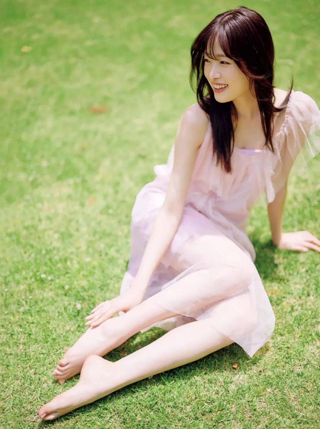 高桥光穿着粉色长裙,她俏脸清丽,五官精致,唇红齿白,微笑甜美,长发飘逸,这位美女坐在草坪上,露出自己的修长的大美腿,更是性感撩人!