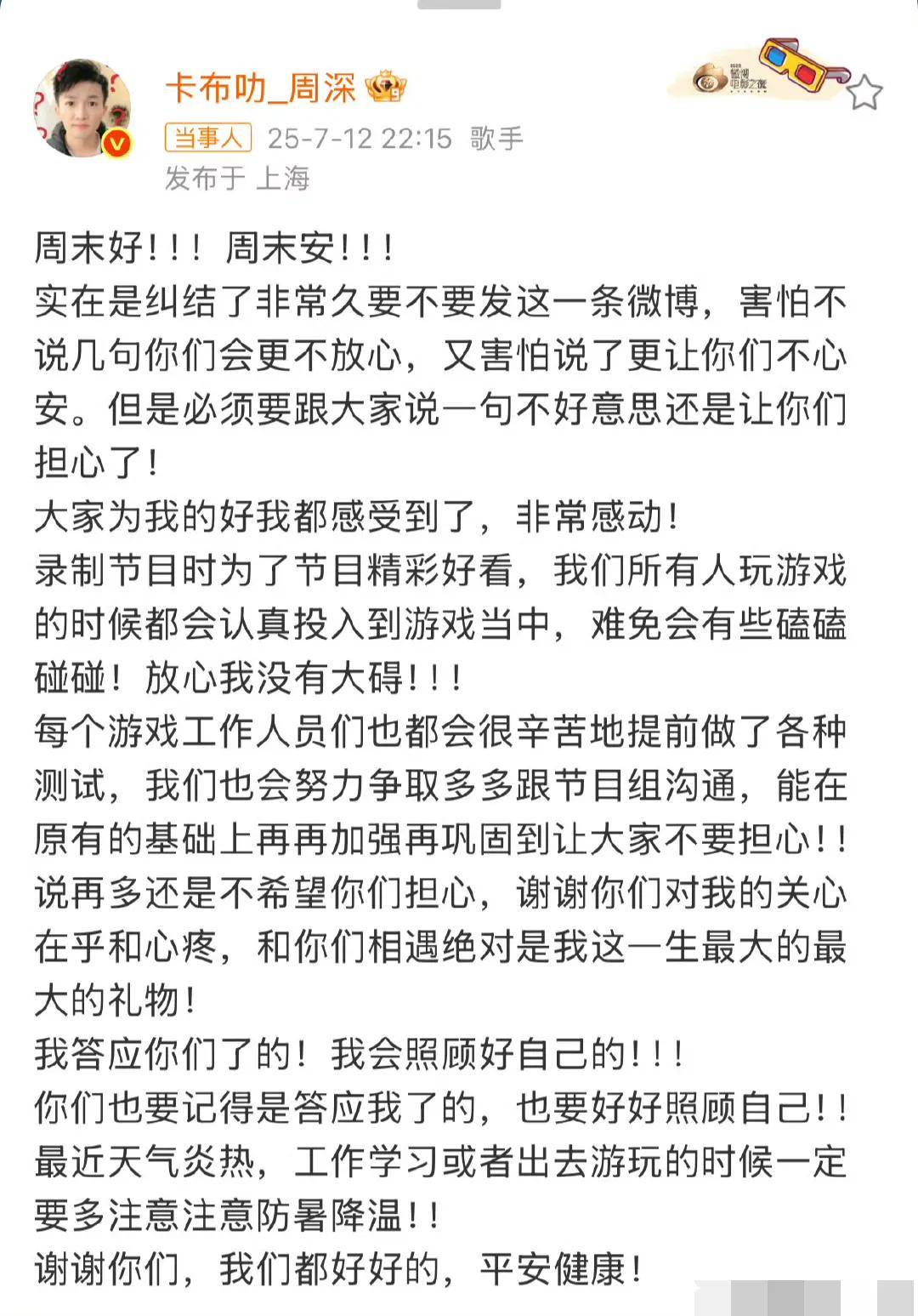 消息传开后,许多网友也纷纷涌入社交平台,表达对周深的关心和支持。有的网友留言认为:希望周深早日康复,不要因为这一点小意外影响他的状态。还有人评论道:这场景真的太惊险了,感觉都替他捏了一把冷汗!可以看出,周深在大家心中已经不只是是个歌手,更是一个值得关心的朋友。
