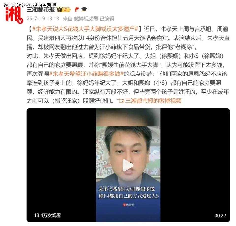 朱孝天现身评论区,说大S生前遗愿就是把孩子给汪小菲照顾,大S花钱大手大脚没留多少遗产,小S能力有限,S妈又老了带不了孩子。
