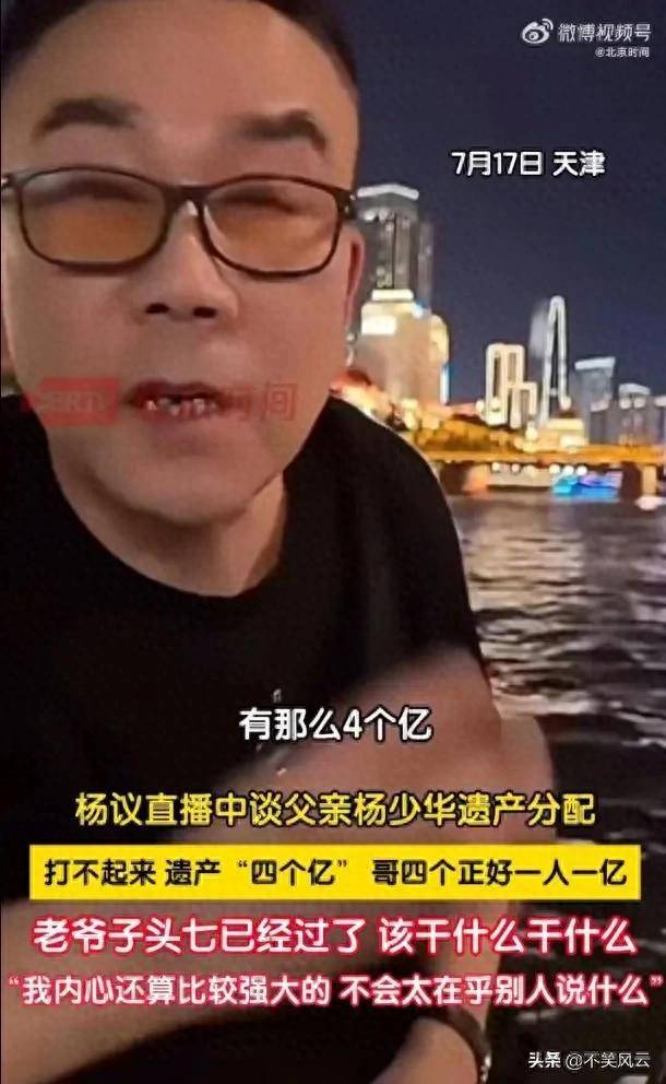 就在7月17日的直播中,杨议罕见的提到了遗产的问题,一句“老爷子遗产四个亿,哥四个一人一亿就分了”。