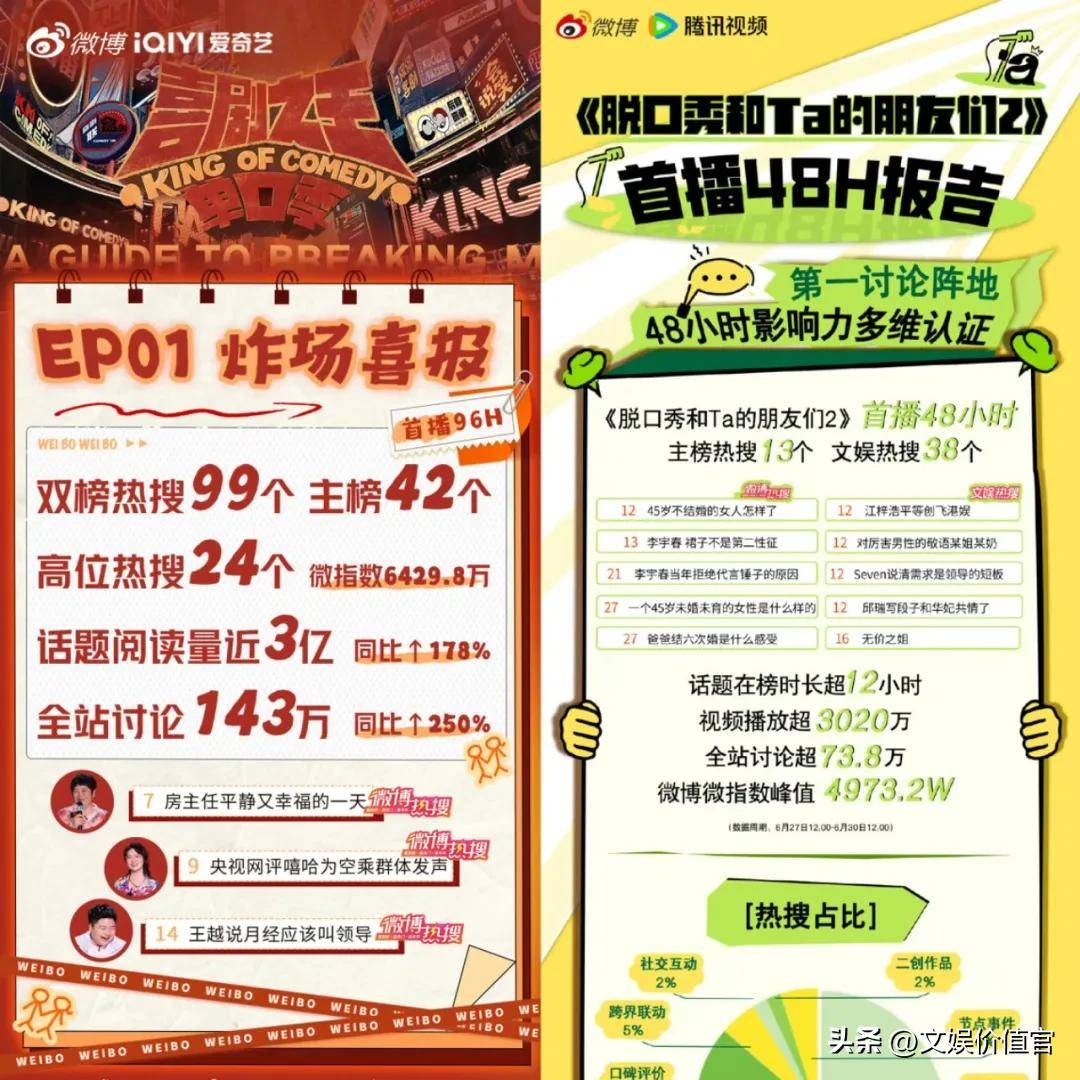 对于任何一档节目而言,最直观的衡量标准往往来自数据。从观众的热情到媒体的关注,再到社交平台的讨论,这一切都能反映节目的真正影响力。《喜单2》无疑在首播中表现亮眼,来自云合的数据平台显示,《喜单2》首期的市占率达到了9%,远超《脱友2》第二期的5.9%。不仅如此,百度搜索指数的对比也显示,《喜单2》开播时的热度高达17926,而《脱友2》则为11103。显然,《喜单2》在开播之际就吸引了更多的关注,带动了整个喜剧综艺市场的升温。