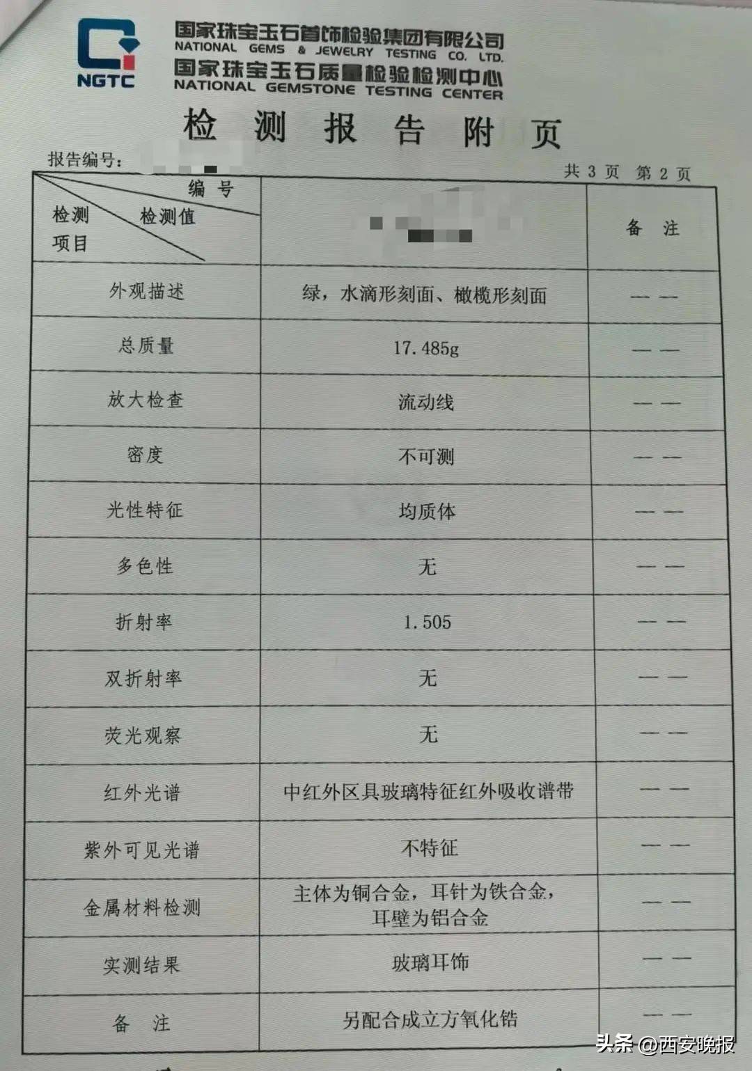 5月29日,在工作组陪同下,杨伟夫妻将“天价耳环”送往位于深圳的国家珠宝玉石首饰检验集团有限公司进行鉴定。据检测报告,杨伟夫妻送检物品为玻璃耳饰,耳饰金属材质为铜合金、铝合金、铁合金等。