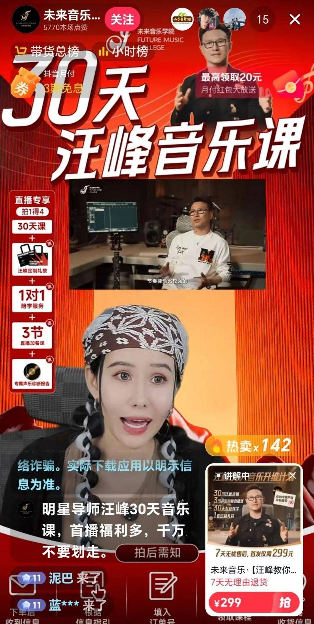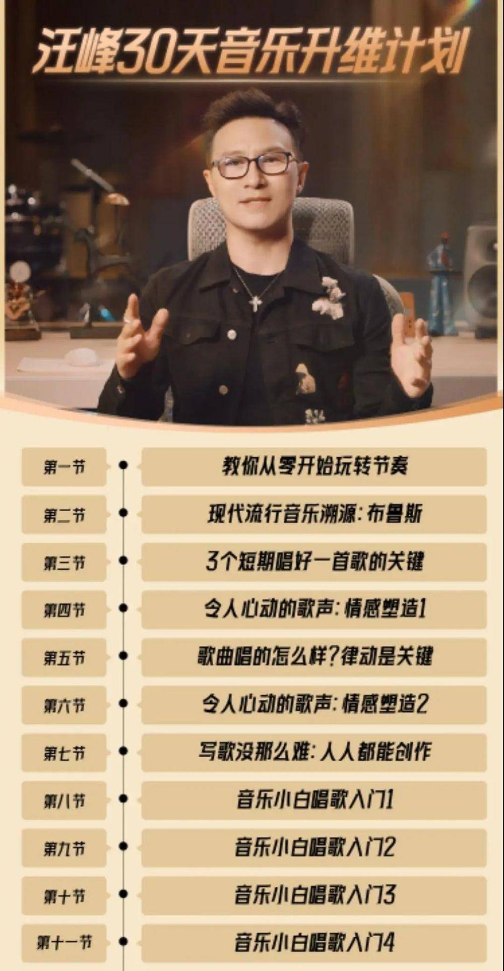 “未来音乐学院”的工作人员在直播中介绍,这份音乐课程是汪峰带领团队研发的,适合零基础的小白学习。30天的学习完成后,还会组织相关考核,特别优秀者可以进阶学习,之后有机会参与汪峰的线下活动,甚至成为汪峰演唱会的伴唱嘉宾。