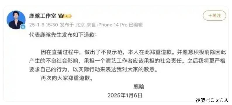 被平台处罚后清醒过来的他,由工作室代为发布道歉声明,表示以后会严格监督自己。