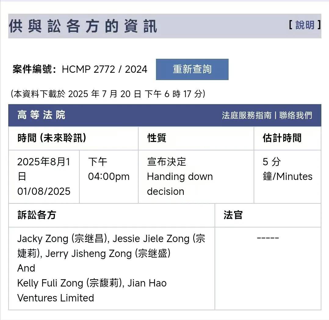 根据法院的消息能够知道,在2025年8月1号,宗馥莉与宗继昌、宗婕莉和宗继盛的遗产纠纷案件啊将正式宣判。