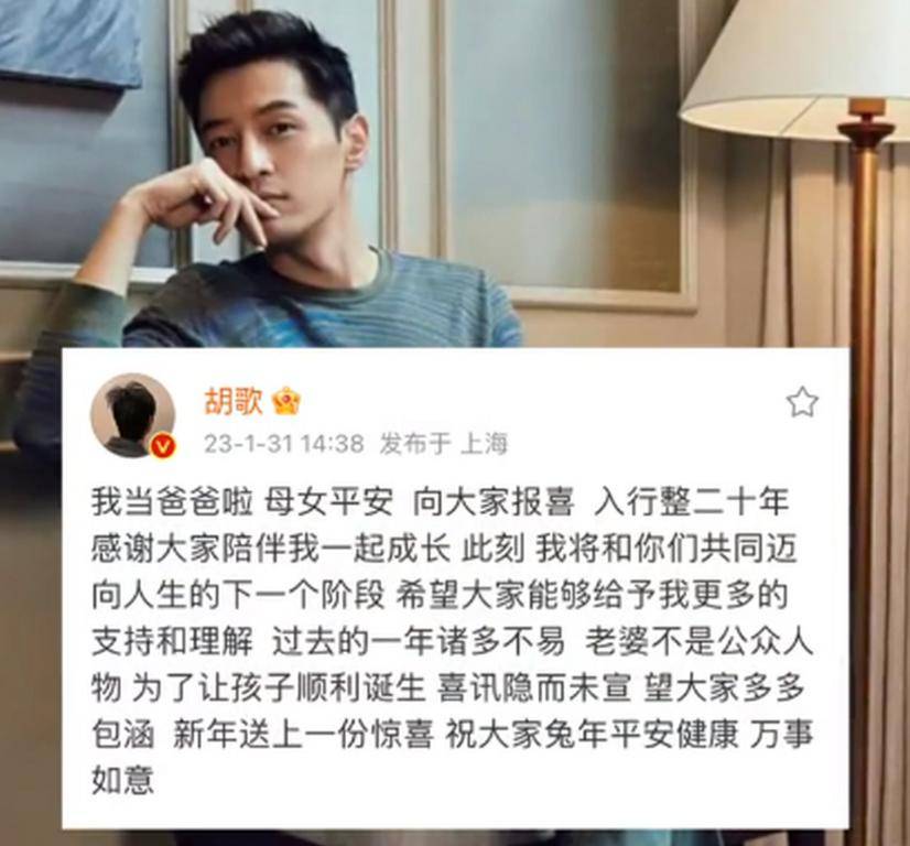 40岁胡歌官宣结婚生女:母女平安,老婆不是公众人物.九观新闻 [引用日期2023-01-31]