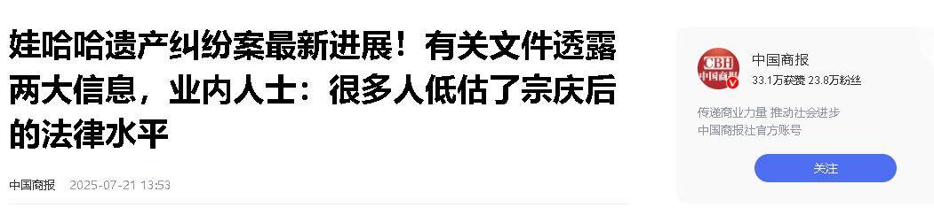 这段时间,宗庆后家族的遗产纠纷在网上闹得沸沸扬扬,很多人都在关注这场豪门家族的“狗血大戏”。