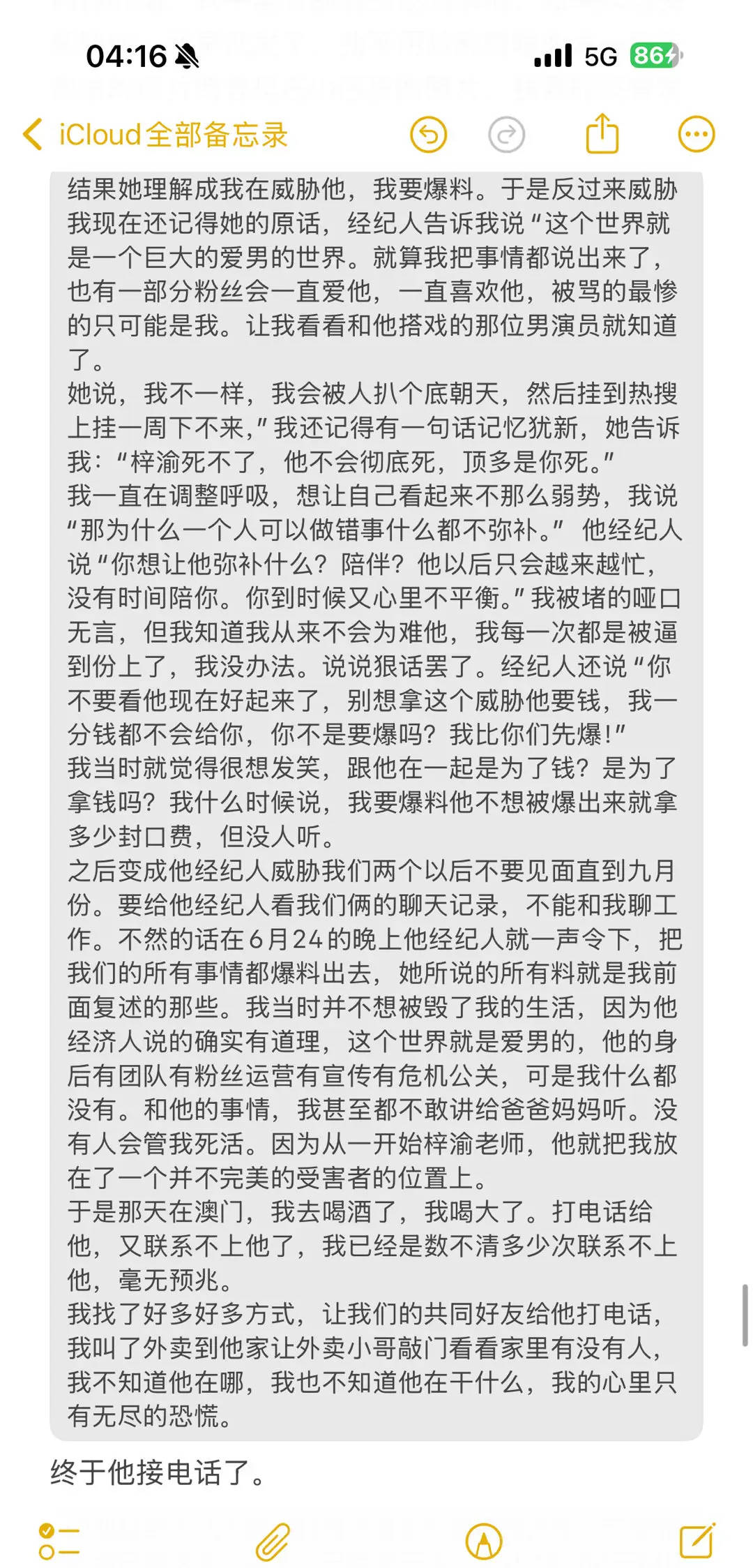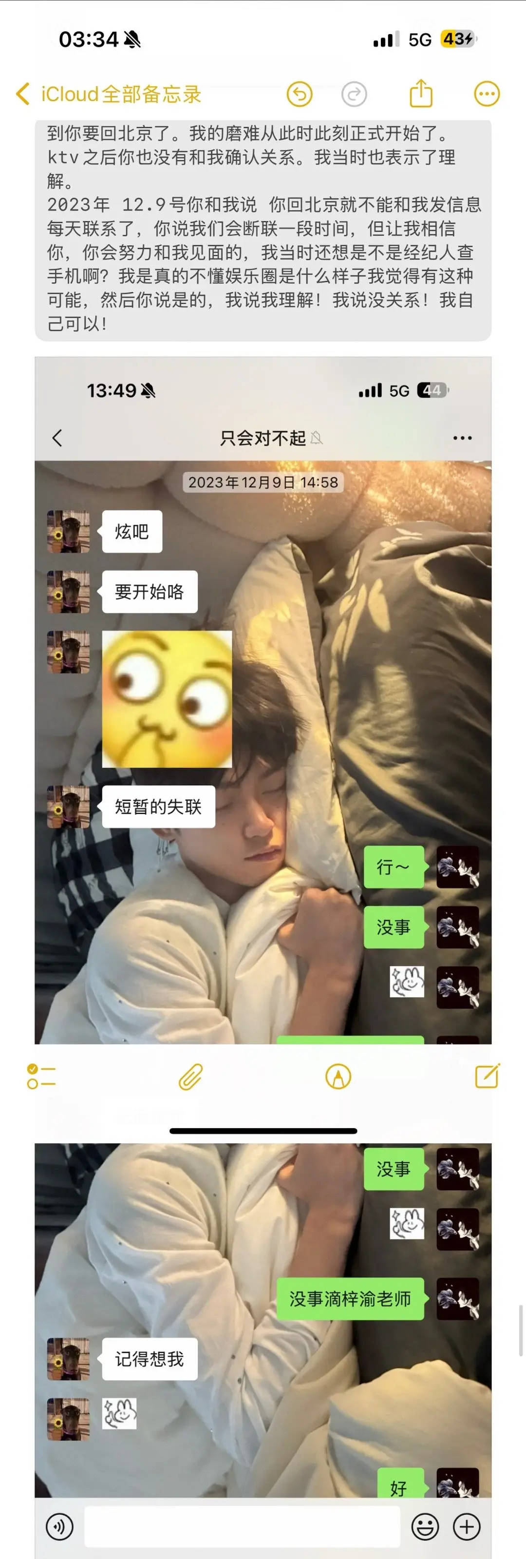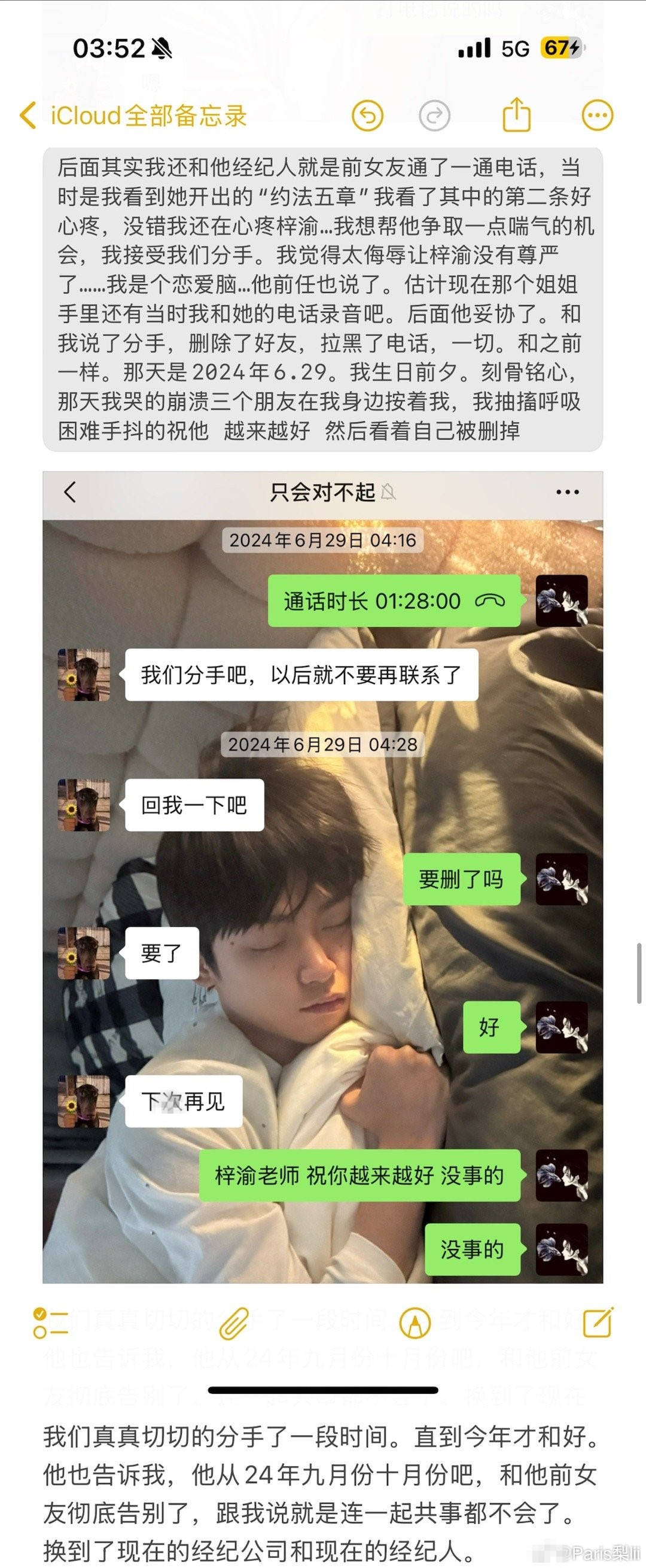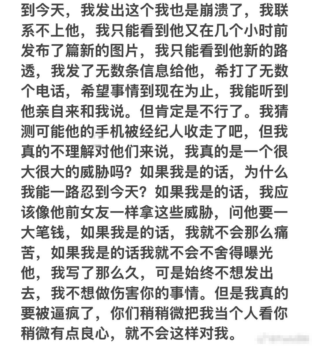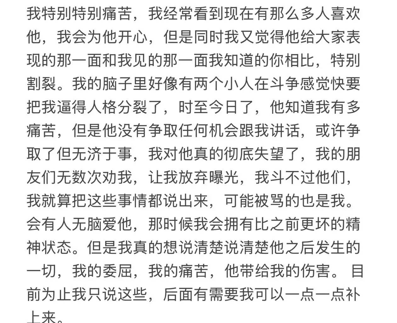 补:7.23晚,他给我发了两条消息,答应了我在和他吵架喝酒情况下说出的气话“分开吧”我甚至不知道是不是他本人发出的,因为他的手机被经纪人控制着。之后又联系不上了。我看着他的话,我明白了他为自己的行为买不了单,付不了责任,跟我说了对不起,但我觉得他不只是对不起我,他对不起的有很多,他自己最明白他做过什么我原谅过什么。我的诉求就是他在大众面前本人,道歉承认自己做过的一切。