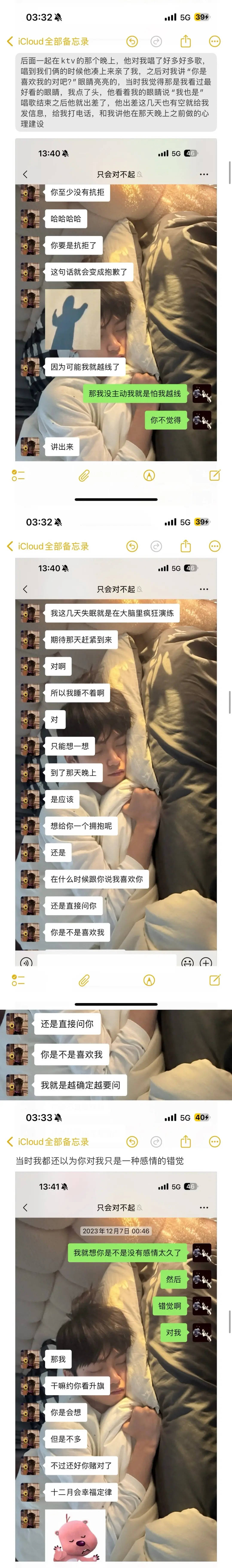 2、2023年12月,两人在KTV约会时梓渝主动亲吻女方,并表白“我也是喜欢你”。此后梓渝因工作出差,但仍保持密切联系。