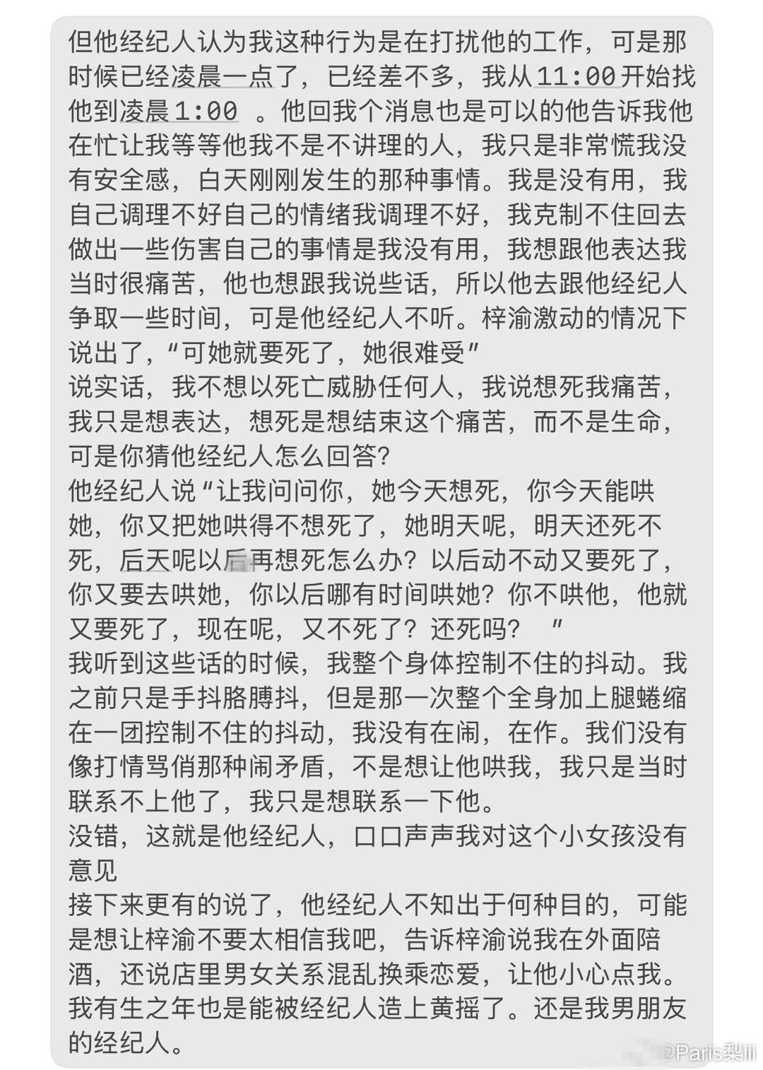 大家好 我是梓渝的女朋友,发这些东西的目的是,我想看他本人站出来承认自己做过的一切和道歉,他失联了,我是一个很没有用的人,我反复找了很多个方法试图联系他,但都无济于事。我猜可能是手机被他的经纪人没收了吧…你每一次只会牺牲我 。躲在后面当缩头乌龟。对于你的失联我很没用的又崩溃了。我缓解不了我的心脏酸涩的挤压感 ,痛得让我喘不过来气 。我 太痛苦了 ,但既然都要发出去了,我就都来说说吧。@我是梓渝_