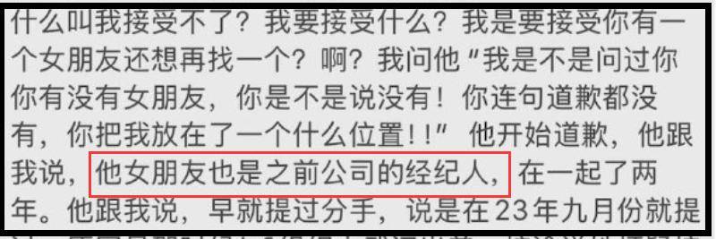 女生到北京要解释之后,梓渝告诉她,自己已经和经纪人分手了,所以她最终又选择和他在一起了一段时间。总的来说,梓渝在2023年底到2024年之间,一直在经纪人和女生之间反复摇摆不定。