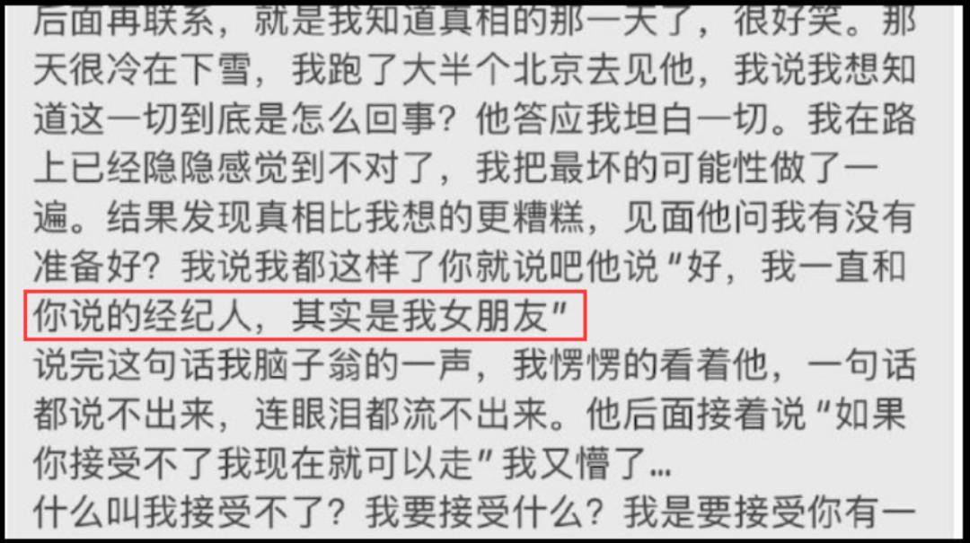 女生完全无法接受这个事实,之后一个人跑到北京找梓渝。此时她终于得到对方的亲口承认,称经纪人其实是他的女友,而且两个人已经保持了两年的恋爱关系。也就是说,当初梓渝和女生交往的时候,其实是脚踩两条船的。