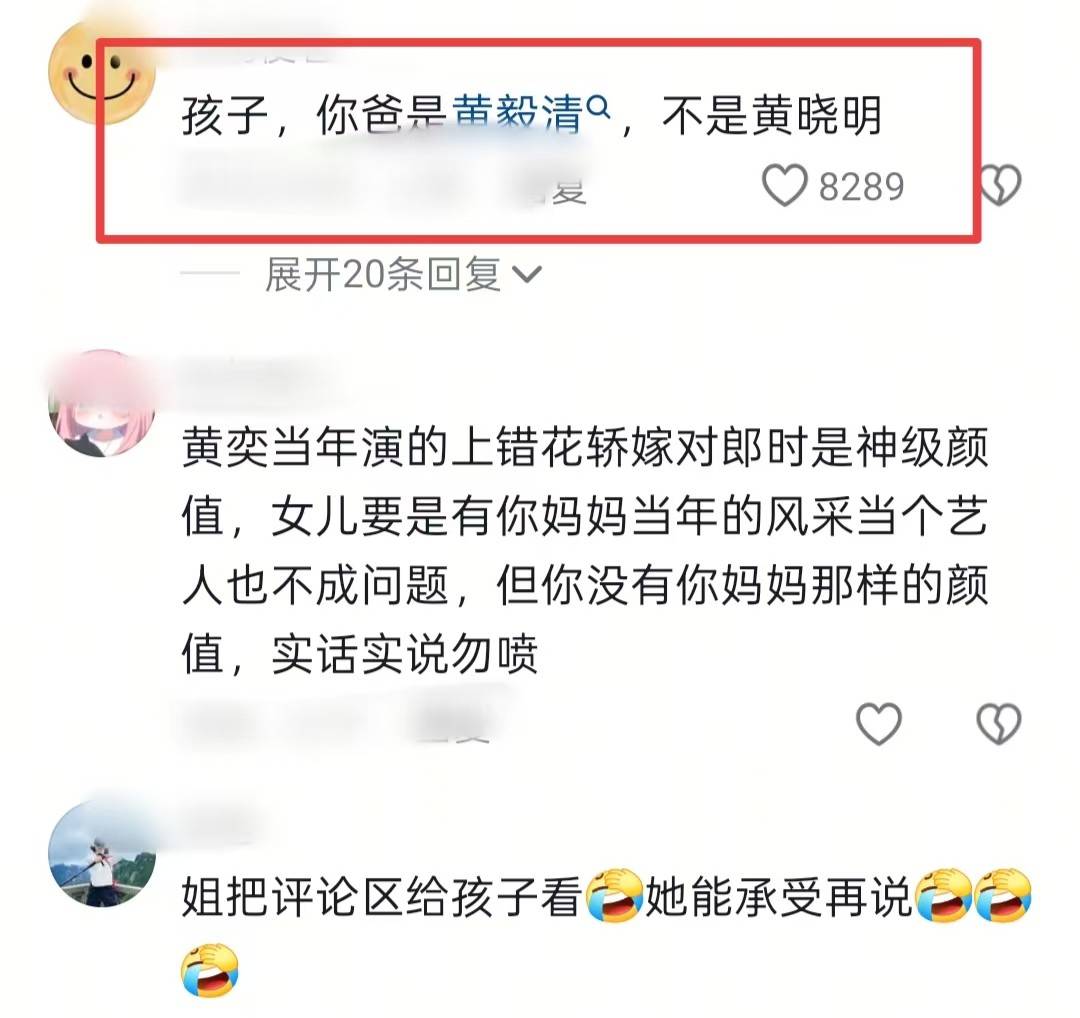 还有网友说出了关键,让黄芊玲认清现实,感慨她的爸爸是黄毅清,不是黄晓明,言外之意黄毅清“拖后腿”了。如果孩子爸爸是黄晓明,那她的颜值会很高,这有利于出道,人脉资源也不用愁。
