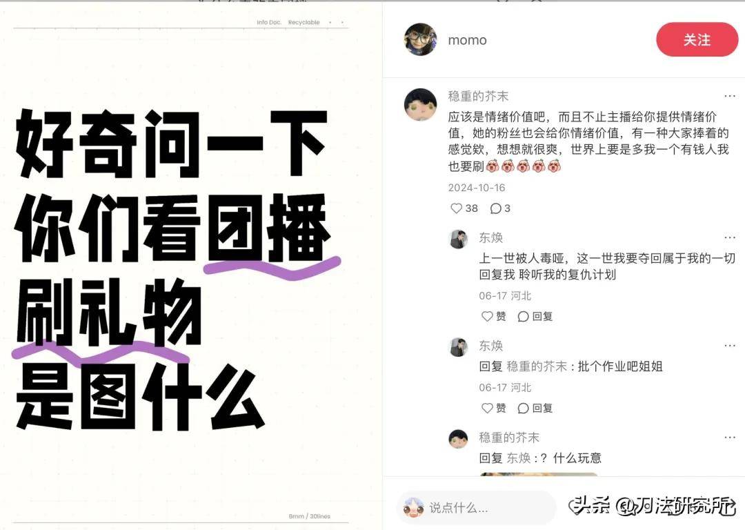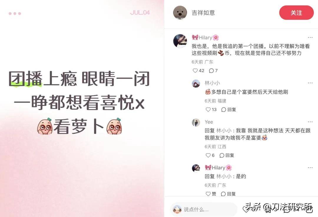 过去那些“榜一大哥”豪掷千金享受主播的夸赞带来的“尊贵感”,而现在的女性粉丝为团播花钱,纯粹是出于爱。