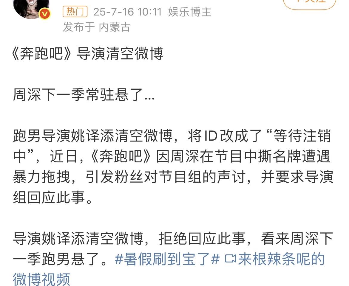 今天,《奔跑吧》的导演在微博上一下子“清空”了自己的账号,甚至将名字改成了“等待注销中”,这一举动迅速激起了网友们的热烈讨论。