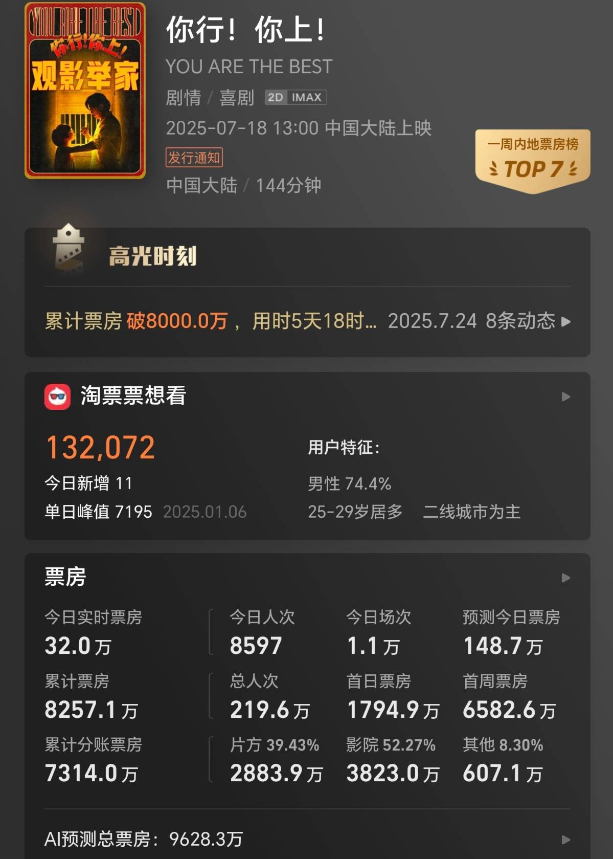 搜狐娱乐讯 (哈麦/文)姜文自导自演的《你行!你上!》上映第七天,单日票房285万元,跌到了日票房榜第八,卖不过《F:狂飙飞车》《侏罗纪世界:重生》等老片,排片占比7.3%,上座率只有2.5%,在前十二部电影中垫底,七天累计票房8225万元。