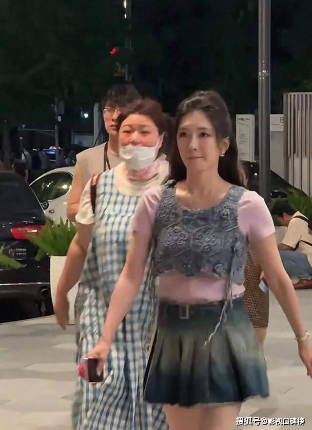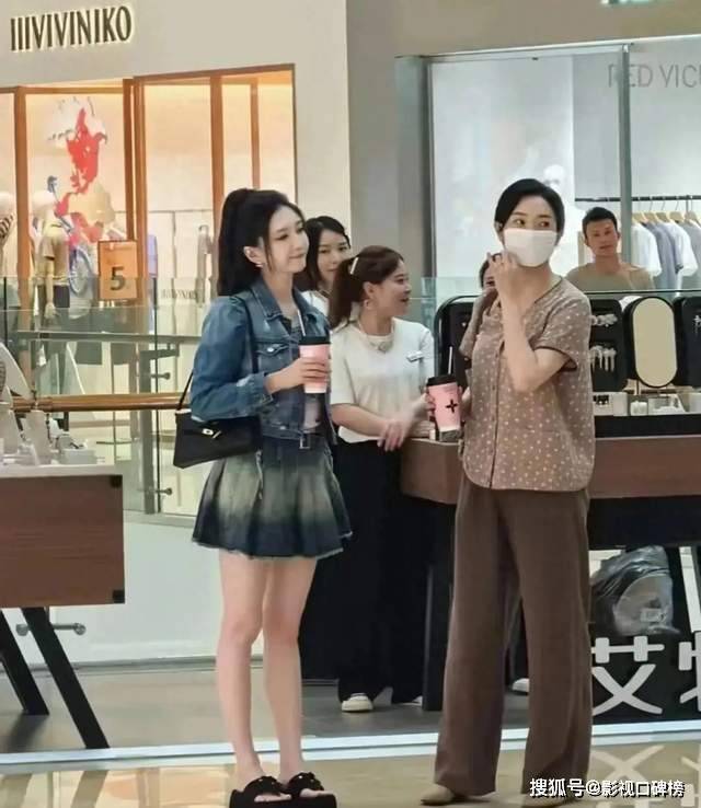江疏影背着一个大大的白色购物袋,一看就是收获满满,另一只手拿着一杯饮料。她与身边的女士一边走,一边聊天很开心。