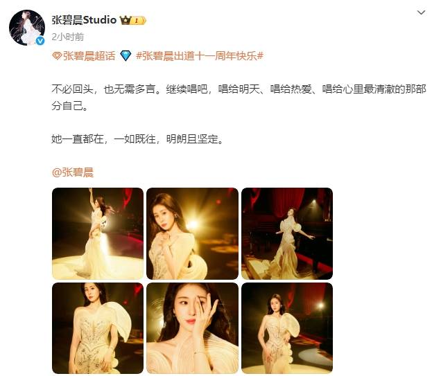 搜狐娱乐讯 26日,张碧晨工作室发文纪念张碧晨出道11周年:“不必回头,也无需多言。继续唱吧,唱给明天、唱给热爱、唱给心里最清澈的那部分自己。她一直都在,一如既往,明朗且坚定。”