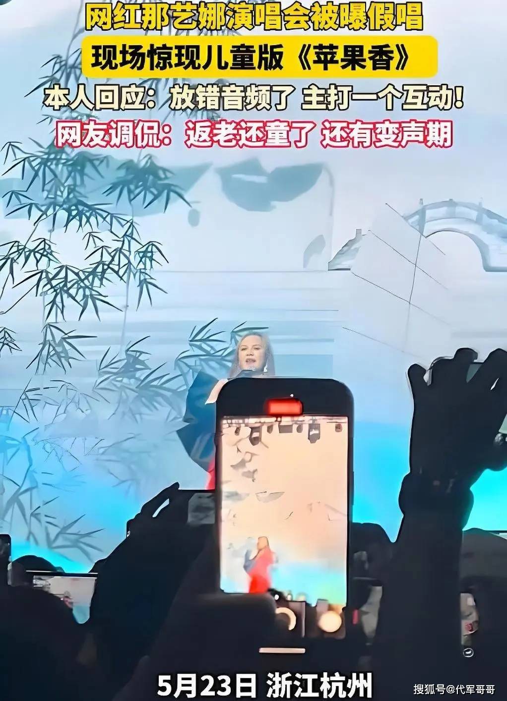 2025 年 5 月 23 日,那艺娜在杭州举办演唱会,本应是一场粉丝与偶像的狂欢,却成了一场令人啼笑皆非的闹剧。在演唱《苹果香》时,音响中突然传出童声录音,而那艺娜却毫无察觉般,对着空气熟练地做着口型,继续 “演唱”。现场观众瞬间炸开了锅,“退票” 声此起彼伏,场面一度失控。面对如此尴尬的局面,那艺娜团队事后给出的解释令人匪夷所思。先是称音响师放错了音频,将责任推给无辜的幕后人员;后又改口说,是应现场观众的要求切换歌曲,试图将这场事故包装成一场与粉丝的互动。但只要稍有判断力的人,都能看出这些解释漏洞百出,纯粹是在侮辱观众的智商。