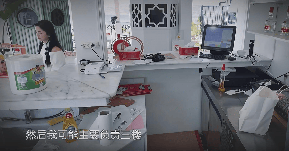 先回想那个经典的画面哈。沈月呢,手上拿着一摞菜单,在三楼慢慢地走来走去。