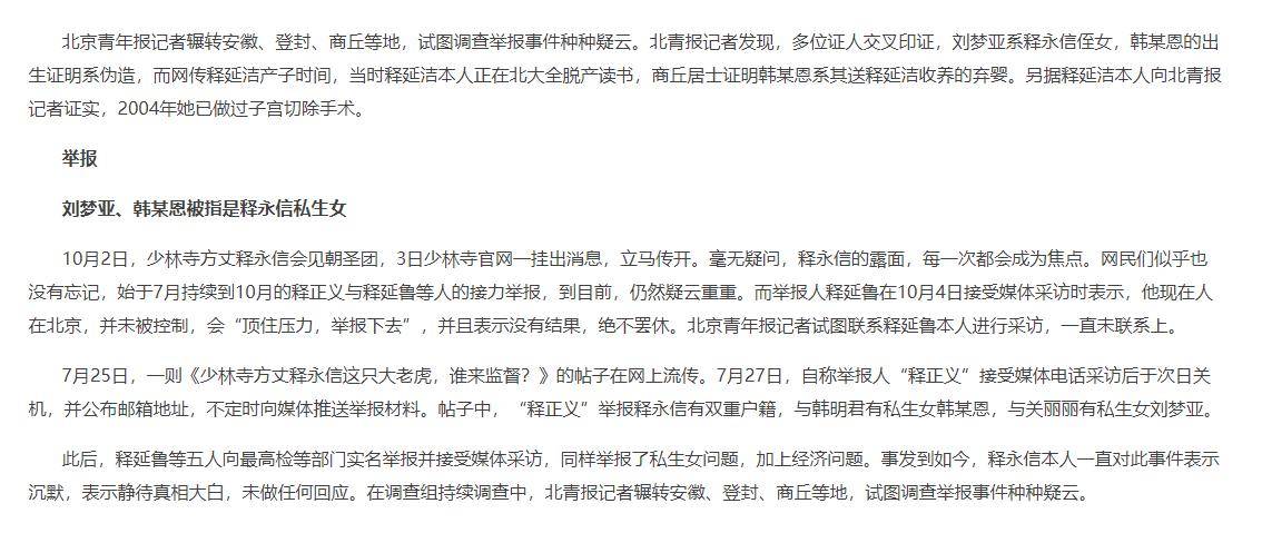 更劲爆的是,还有人爆料说韩明君为释永信生有一女叫韩某恩,户籍还挂在释永信母亲名下,这种说法如果属实,简直就是佛门奇闻了。