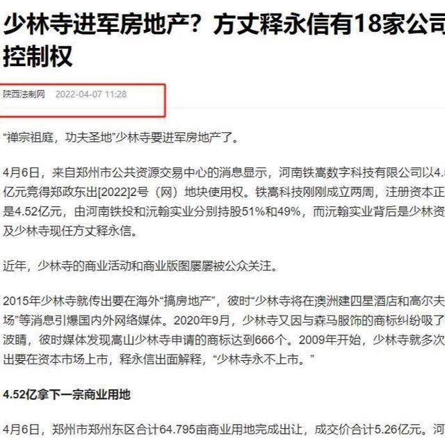 我翻了下资料,光是2022年,少林寺关联公司就以4.52亿元的价格在郑州郑东新区拿下一块商业用地,这在当时可是震惊了整个地产界。