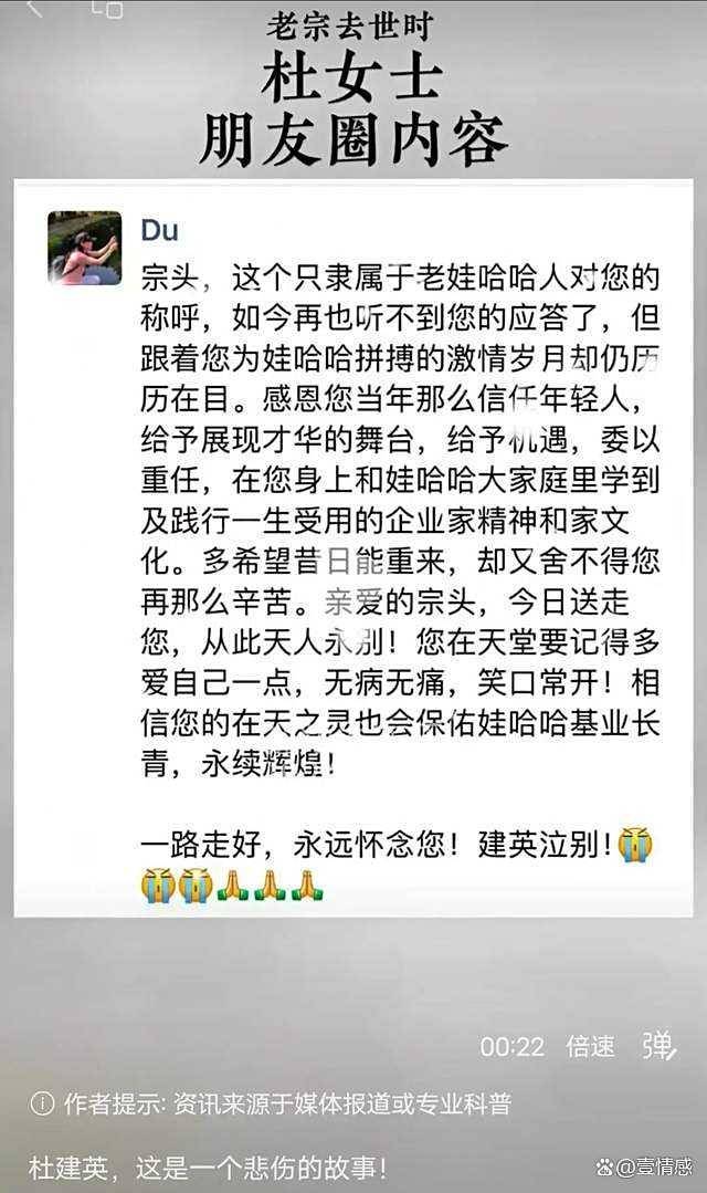 去年2月宗庆后离世时,杜建英发了一条悼念动态,称呼宗庆后为“宗头”,感谢他的信任和提携,叮嘱他“在天堂要记得多爱自己一点”。