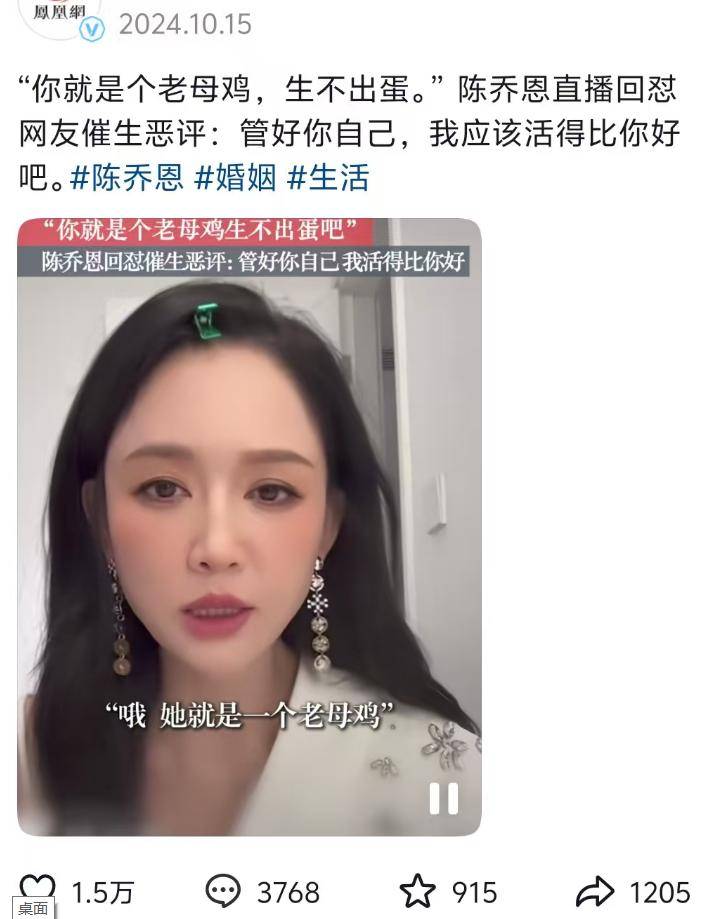 还有网友扒出陈乔恩曾经的一段直播,当时,有网友因为她不生孩子的言论,直言她可能不是不想生孩子,而是生不出孩子,她和伴侣的感情必然不会长久。