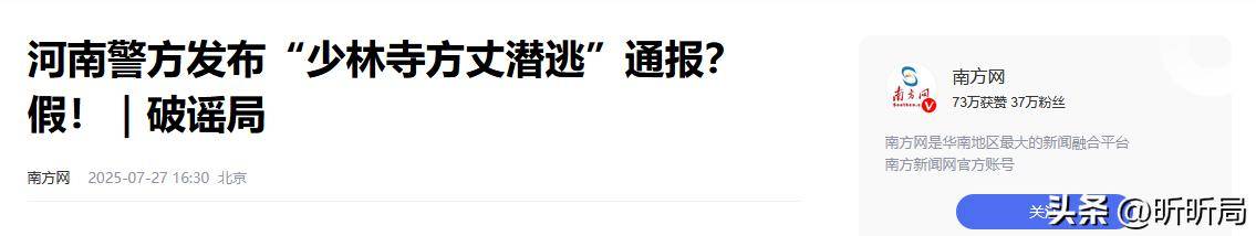 河南警方发布“少林寺方丈潜逃”通报?假!|破谣局 南方网 2025-07-27