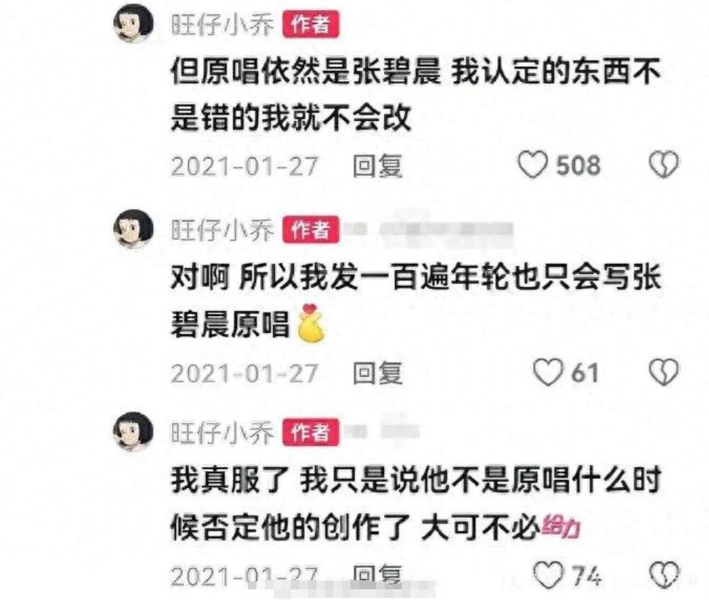 网红旺仔小乔近期在网络中发表逆天言论,说这首歌的原唱只有张碧晨,汪苏泷不过只是个写歌的,但是她无知的是,竟然不知道汪苏泷实际上拥有《年轮》的全部版权。