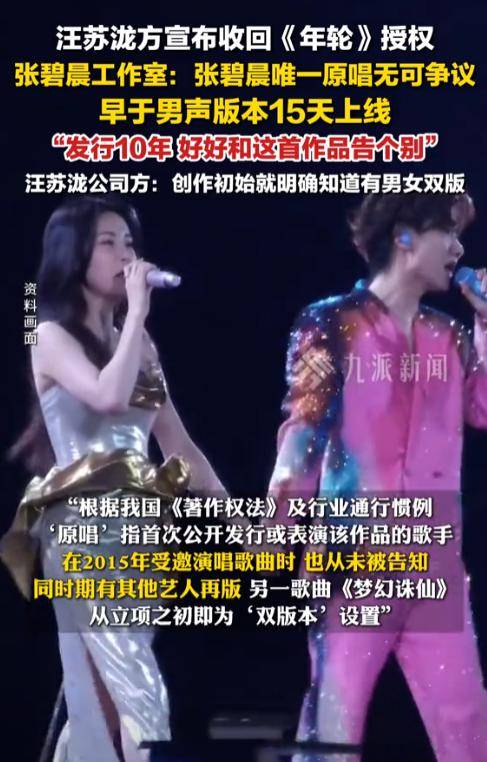 7月25日凌晨两点,张碧晨工作室发布关于此事公告,并在公告中表示张碧晨是该作品的唯一原唱,而这一举动再次引发了一场粉丝大战,而期间沉默已久的汪苏泷也不得不出面应对。