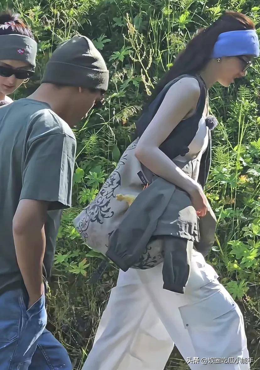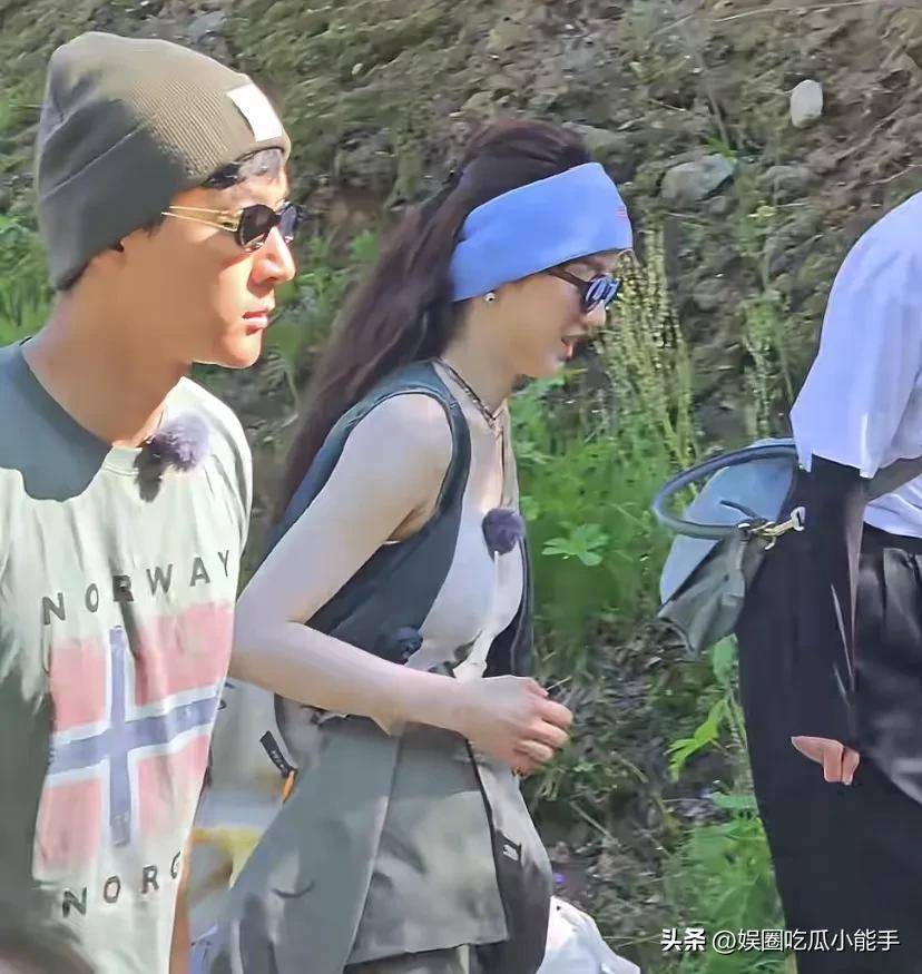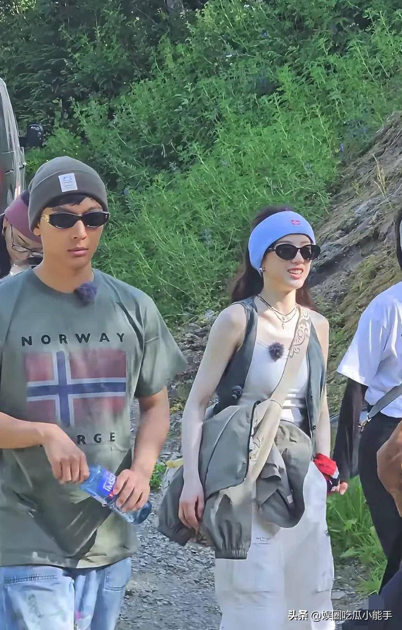 紧随其后的是陈数和李沁。李沁身着清新的白上衣,搭配黑色裤子和墨镜,在阳光下显得格外光鲜,真是让人羡慕的肤色。而陈数则背着一个大大的书包,穿着一件白色登山服,步履坚定,直冲前方。