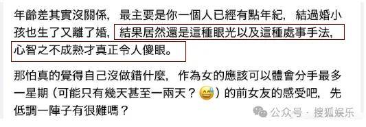 “结过婚小孩也生了又离了婚,结果居然还是这种眼光以及这种处事手法,心智之不成熟才真正令人傻眼。”