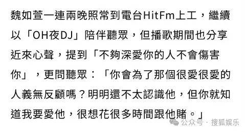 根据魏如萱参加电台节目的发言,多少能看出她的感情态度。昨晚她在电台里问听众:你会为了很爱很爱的人义无反顾吗?明明还不太认识他,但是你就知道我要爱他,很想花很多时间跟他赌。