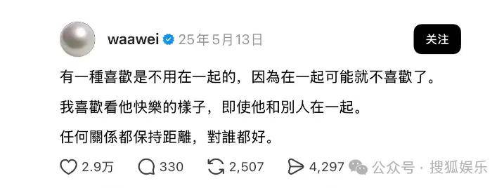 早在今年五月份,魏如萱就曾发文“有一种喜欢是不用在一起的”、“我喜欢看他快乐的样子,即使他和别人在一起”、“任何关系都保持距离,对谁都好”......