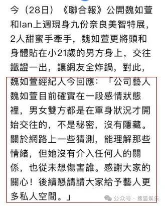 遭曝恋情且再次被指疑似“小三”后,魏如萱方开始慌了,赶紧承认恋情并否认插足:“目前确实在一段感情状态里,男女双方都是在单身状况才开始交往的,不是秘密,没有隐藏。同时也感谢大家的关心!后续恳请大家给予艺人更多私人空间。”