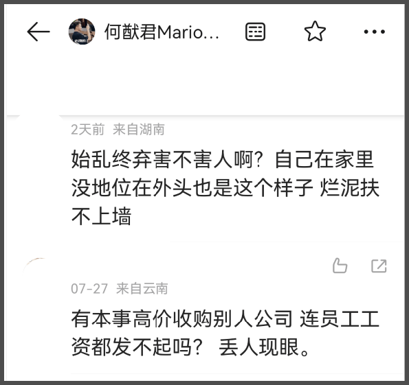 最近何猷君先是被曝欠薪,不少人都跑到他评论区留言讨薪,甚至还传出他资金链断裂的传闻。