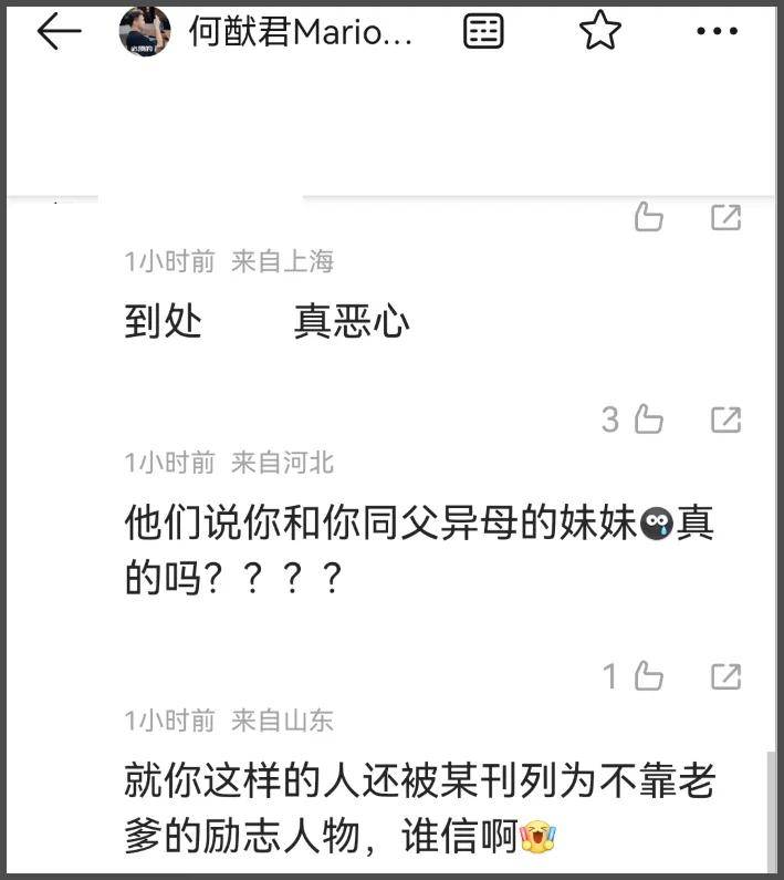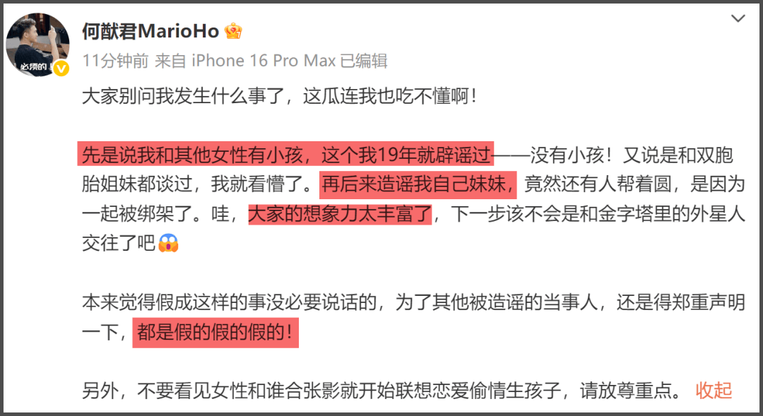 随后何猷君本人也发文回应此事,称所有爆料都是假的,没有私生子,和自己妹妹的事更是造谣,请外界放尊重点。