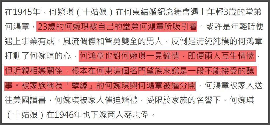 据悉,何婉琪是赌王何鸿燊亲妹妹,当年23岁的何婉琪和小自己3岁的堂弟何鸿章在宴会上一见钟情,但这段感情被家里知道之后自然是不被同意的,两人被迫分开,何鸿章被人送往国外读书,而何婉琪则嫁给了商人麦志伟。