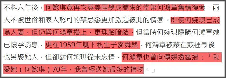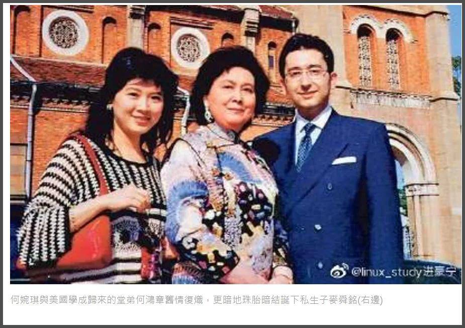 早年赌王十妹何婉琪就曾和堂弟何鸿章相爱,还生下了一个孩子。