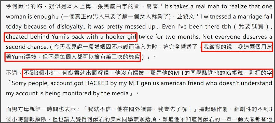 甚至还有网友扒出何猷君早年留学黑历史,他曾发文自曝嫖娼,但之后删除了内容,之后何猷君回应此事表示是自己MIT的同学黑进了他的账号乱打字,四太也力挺儿子,说不信这种谣言,儿子在国外读书的事情她都会先了解,才平息这场“恶作剧”风波。