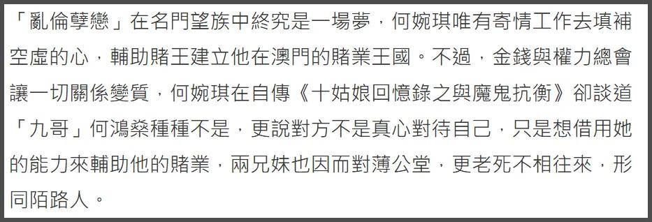 不过乱伦恋终究只是一场梦,何鸿章不知道何婉琪怀孕,另娶了别人。而何婉琪后来也专注事业,辅助九哥何鸿燊建立了庞大的商业王国。但兄妹反目也是因为利益,何婉琪曾在书里吐槽何鸿燊对她不是真心。