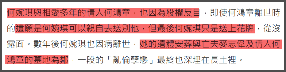 还有,别看何婉琪和何鸿章爱得都不顾伦理,但两人晚年最终也是因为股权反目,何鸿章临死前希望何婉琪能亲自送别他,但最后何婉琪也只是送上花牌,始终没有露面。