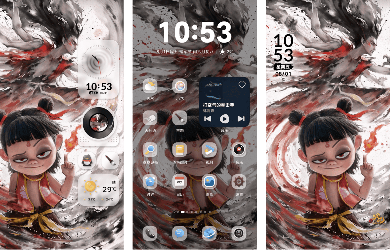 我也真算是个哪吒迷了,玩手机的时候发现华为主题居然有哪吒主题的,立刻安排上,别说还真挺好看的,表盘也不能落下,都换上!