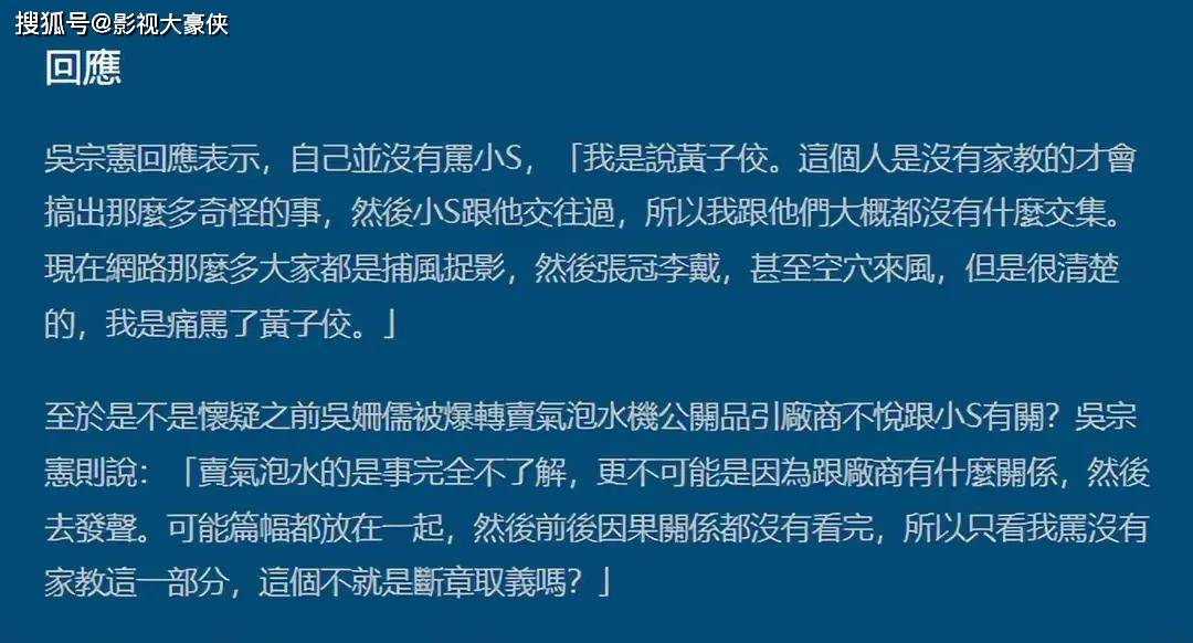 至于说大小S没有家教,此前吴宗宪就用了张冠李戴,断章取义来回应,认为他说的话,前后因果关系没被充分理解。